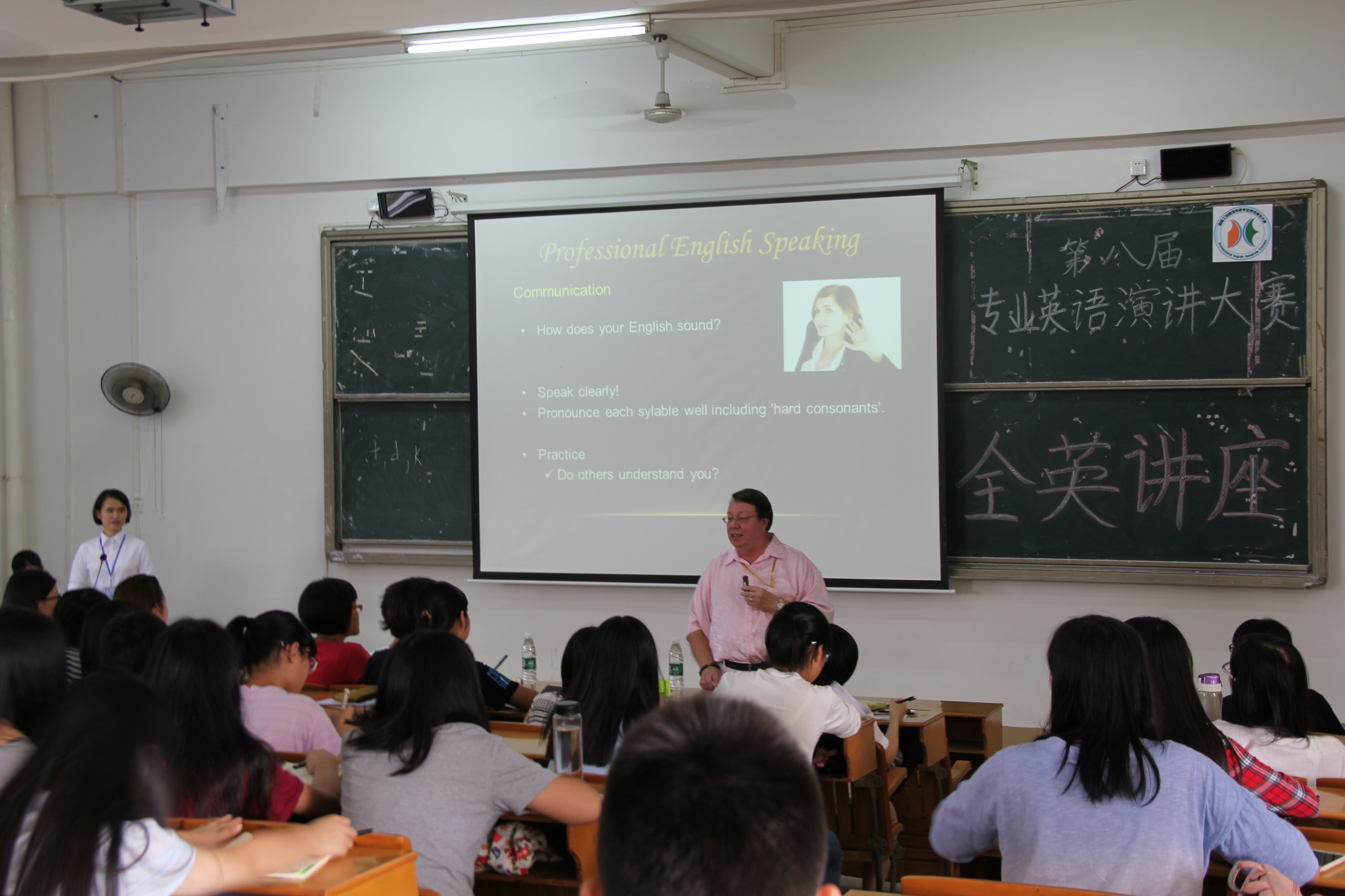 本网讯 2015年10月29日下午,国际工商管理学院第八届专业英语演讲大赛之全英讲座在C302成功举行,外教Mr.John和第七届专业英语演讲大赛优秀选手陈明辉师兄作为嘉宾出席了此次活动。