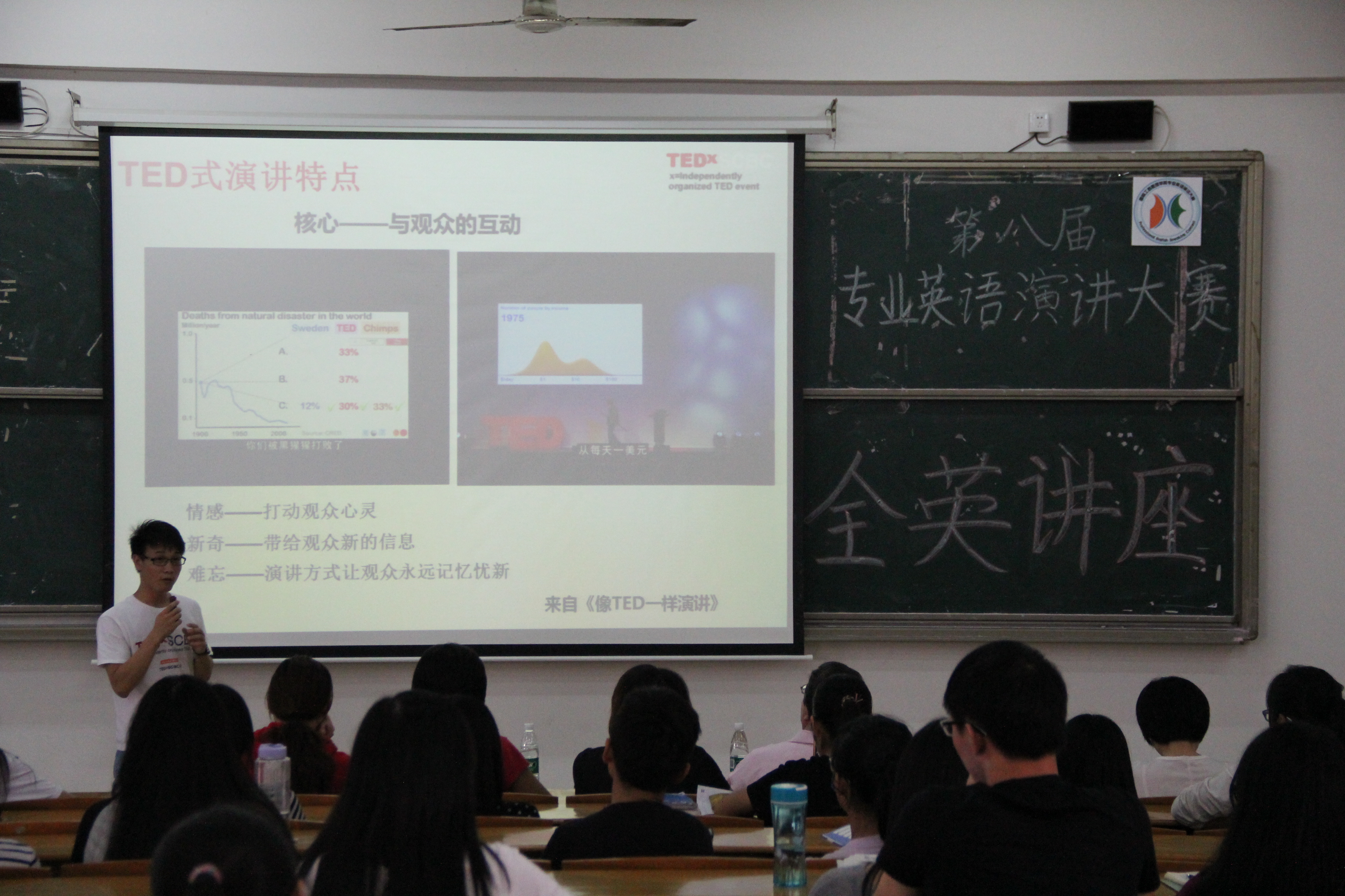 接着,作为第七届专业英语演讲大赛的优秀选手,陈明辉师兄在演讲前播放了相关的演讲视频,并且讲解了TED式的演讲特点,分析了选手们在英语演讲中可能会出现的问题,也给各位选手介绍了自己的演讲经验与方法。