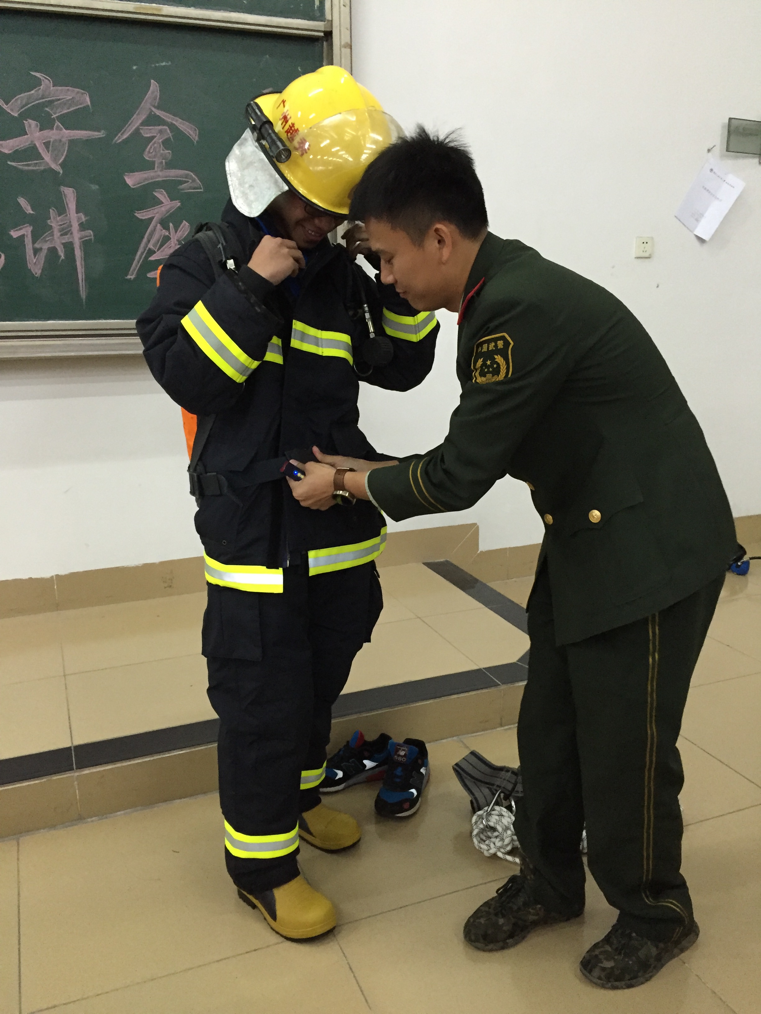 在本场讲座中,曾庭民不仅指出了当前大学生消防知识掌握欠缺的问题,而且用他12年的消防兵经历告诫我们,“防火比救火更重要”。他讲述了在不同火灾情景下,人们面对火灾该如何做到先自救后救人,保证自己的生命安全以及在日常生活中如何防火防电。在提问环节,同学们纷纷提出自己对消防安全方面的疑问并从曾庭民那里获得了满意的答复,更有同学在消防嘉宾的帮助下借此机会亲身体验了一次穿消防服的感觉,全场气氛都非常活跃。