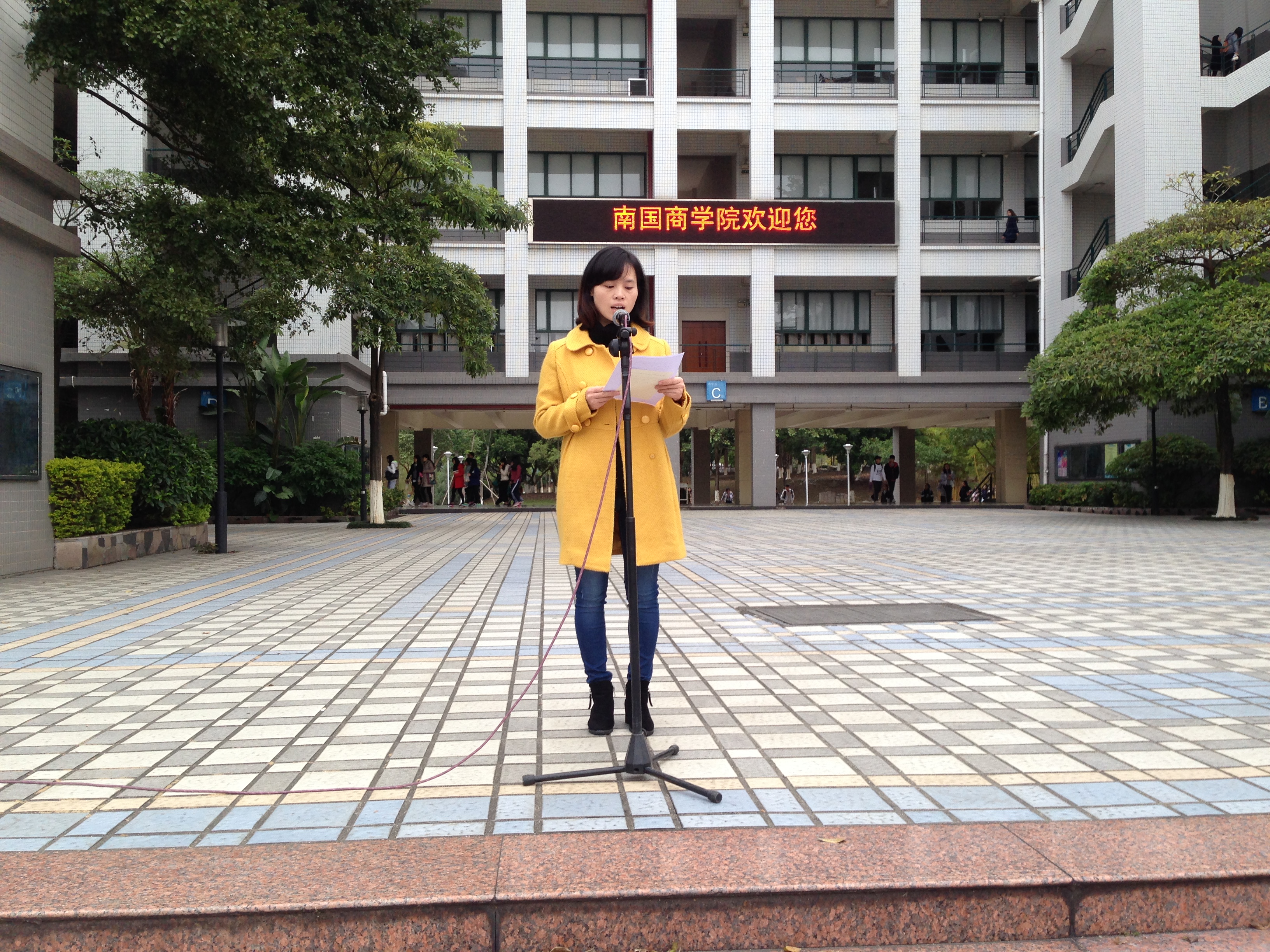 在全体师生的注目礼下,英姿飒爽的国旗手们踏着整齐的步伐护送鲜艳的五星红旗,随着雄壮国歌的响起,全体肃立,五星红旗冉冉升起,迎风飘扬,同学们深怀着对祖国无限热爱。升旗仪式后,管理学院团委书记刘梦文老师上台发言。此次发言的主要内容是通报本学期学生工作的创新点总结。首先,我院新增两个学生组织:管理学院大学生自律委员会和管理学院大学生党员服务站。其次,学院团委第一次取得了白云区“志愿在康园”项目的管理权。第三,我院首次举办的“舞动南商”大赛,这使我院获得了学校第九届文化艺术节组织奖一等奖,且该项目获得优秀项目奖。第四,首次开展了贫困生认定工作,且本学期我院12注会5班郑茹丹同学获国家奖学金;58名同学获国家励志奖学金荣誉称号;290名同学获得国家助学金;370名同学获学校各类奖学金。最后,刘梦文老师希望同学们在接下来的日子里同学们能认真学习备考,诚实应考,并预祝同学们在各类考试中取得好成绩。