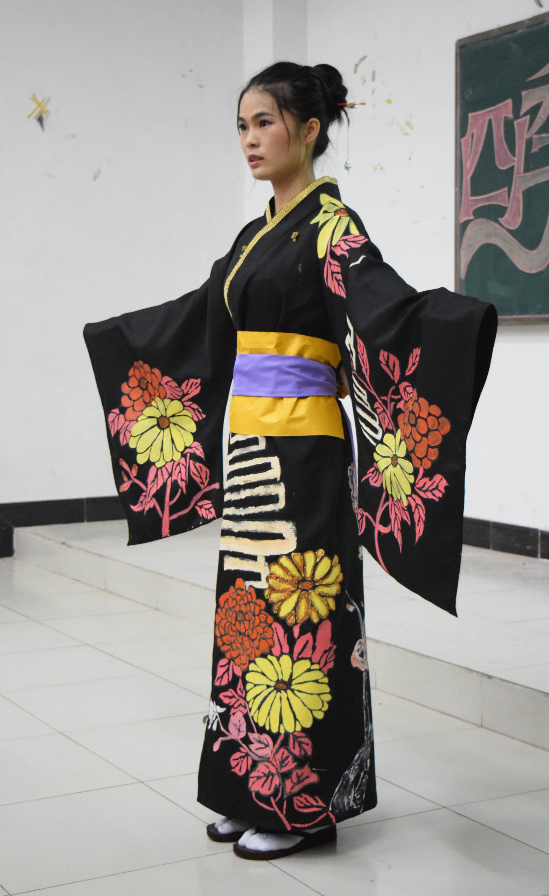 在我们的期待中,一件件精心设计的作品呈现在大家眼前。整场比赛紧吸着观众眼球,有由旧衣服旧蚊帐经过精心剪裁缝制而成的长裙;有由废弃材料塑料棒剪裁后粘贴而成的短裙,也有精心制作富有民族特色的和服,更有展现东方女性柔美的中华旗袍……不一样的制作方式展现出不一样的美,每一支参赛队伍都将环保的理念展现得淋漓尽致。加入了四季的元素参赛作品,与初赛的服装相比,多了几分创新与活力,从中也可以看出同学们对本场复赛的重视。在欣赏了8组独具匠心的作品后,国际工商管理学院学生会艺术团歌唱队为我们带来了动听的歌唱表演,同时缓解了比赛紧张的气氛。在精彩的歌唱表演结束,剩余的8支队伍也陆续登场,他们的作品也不逊色,让人眼前一亮。