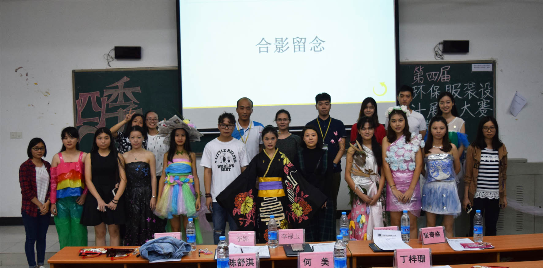 本网讯 2016年10月18日晚上19点,第四届环保服装设计展示大赛复赛在G106顺利举行,国际工商管理学院党员服务站指导老师李禄玉老师,国际工商管理学院大学生自律委员会指导老师魏迅鸿老师,国际工商管理学院学生会指导老师李娜老师,hydra模特队队长何培彬以及Eco模特队队长张奇临作为评委出席了本次比赛。
