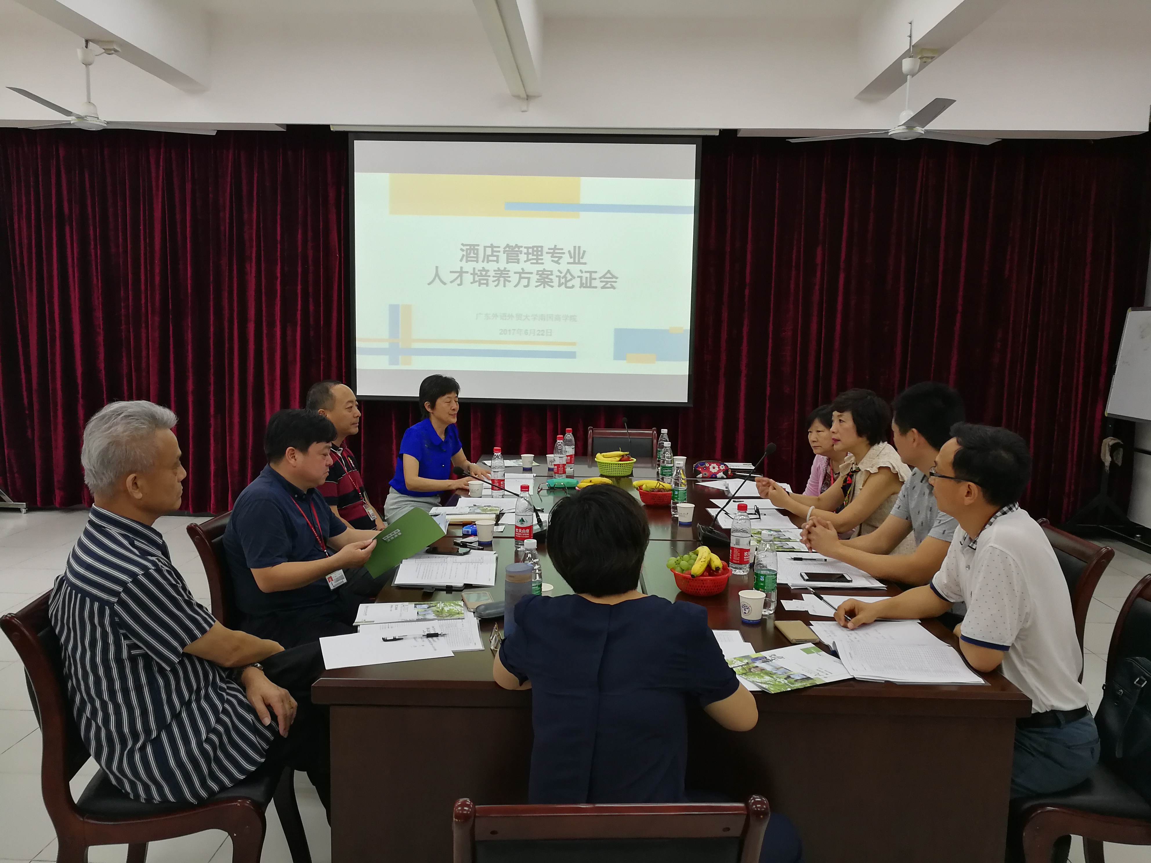 本网讯 近日,国际工商管理学院酒店管理专业人才培养方案专家论证会在F204召开。论证会邀请了校内外的专家共同对人才培养方案课程建设进行了探讨。其中,校外专家分别是原华南师范大学旅游管理系主任甘巧林教授,广州文华东方酒店人力资源总监王晓丽女士,广州市旅游景区协会秘书长邹义荣先生。校内专家由赖志立副校长,王心洁副校长,杨励副校长,教务处处长周文贵教授,管理学院文佑云副院长,以及旅游管理系陈书星主任组成。会议由杨励副校长主持。