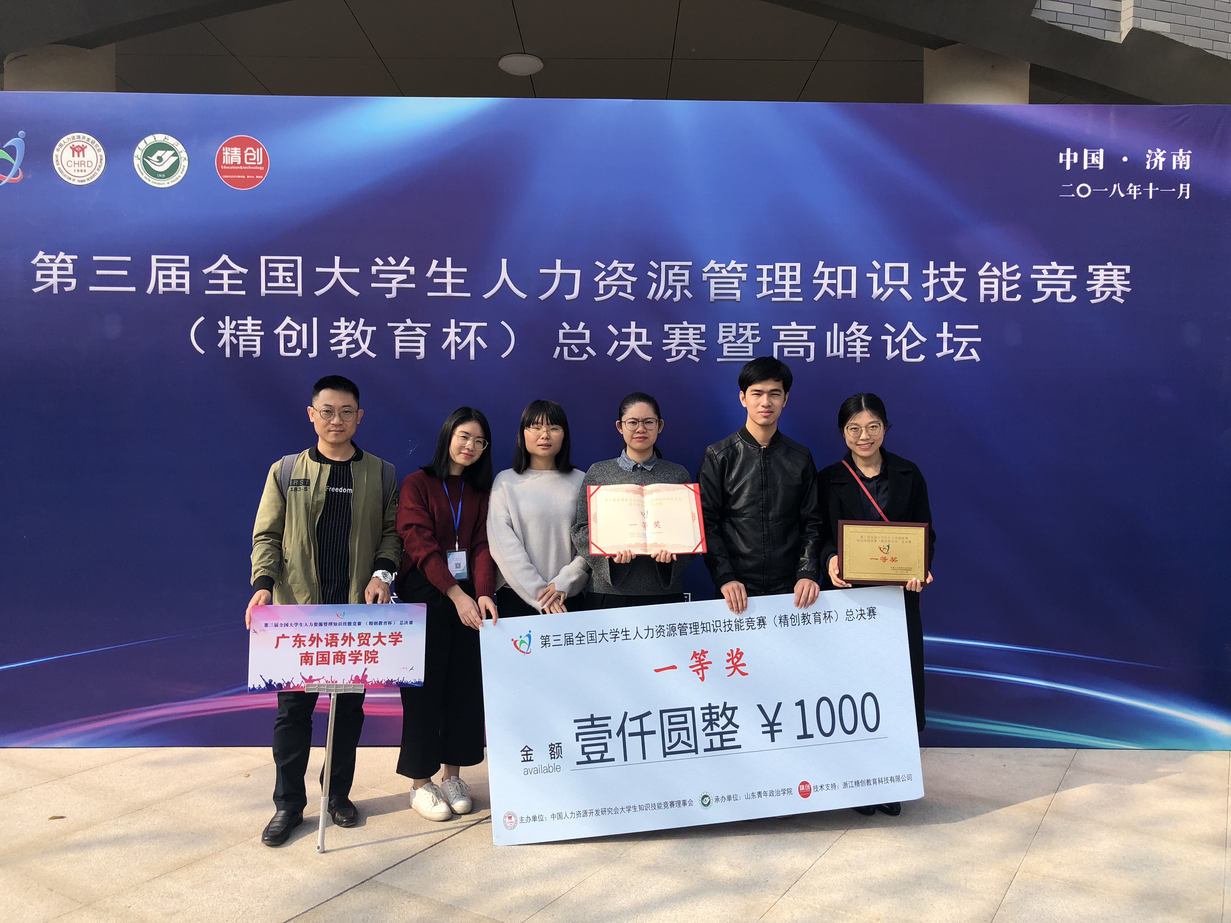 本网讯 11月3日至4日,第三届全国大学生人力资源管理知识技能竞赛(精创教育杯)总决赛暨高峰论坛在山东青年政治学院成功举行,我院2016级人力资源专业学生刘浩天、刘昕怡、戴维、陈敏娜组成的参赛团队在王天和袁珊珊老师的指导下,最终荣获全国总决赛一等奖。