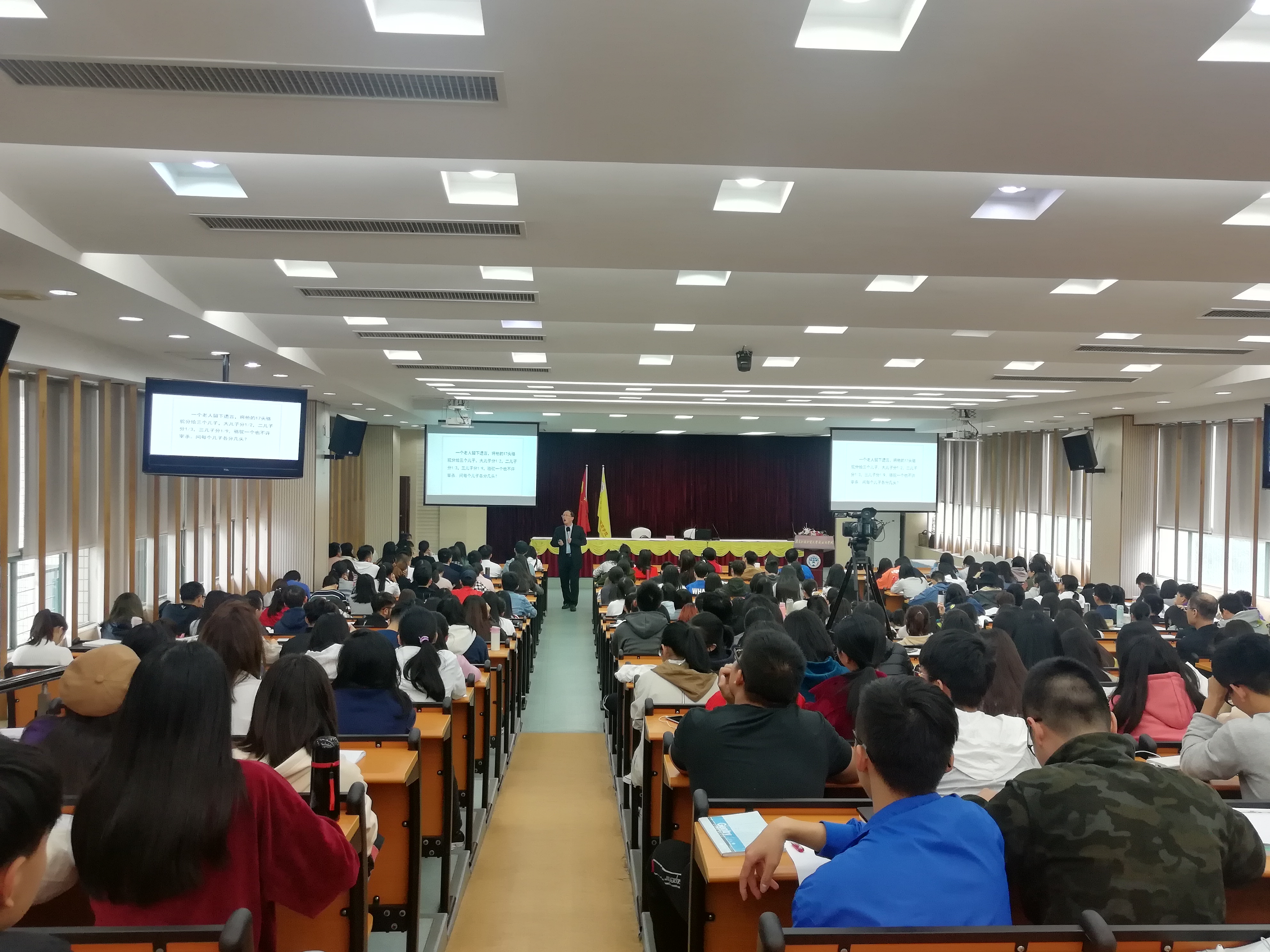 王教授开讲,从“分遗产”、“分骆驼”、“一张白纸能做什么”三个小游戏及思考题开始,让现场的听众参与思考和积极分享答案。现场反应热烈,同学们都在积极思考游戏中的答案和可能性。这三个游戏都没有唯一的标准答案,它启发的是人的三种思维方式,分别是:“发散思维、逆向思维和侧向思维。”