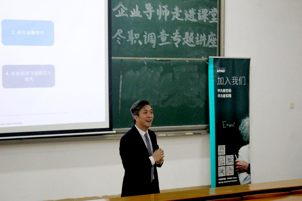 2019年4月18日下午,毕马威服务中心(KDC)在雷竞技官网C402开展 “尽职调查”专题讲座,本次讲座嘉宾是毕马威服务中心运营总监Benny和人事经理Carol。