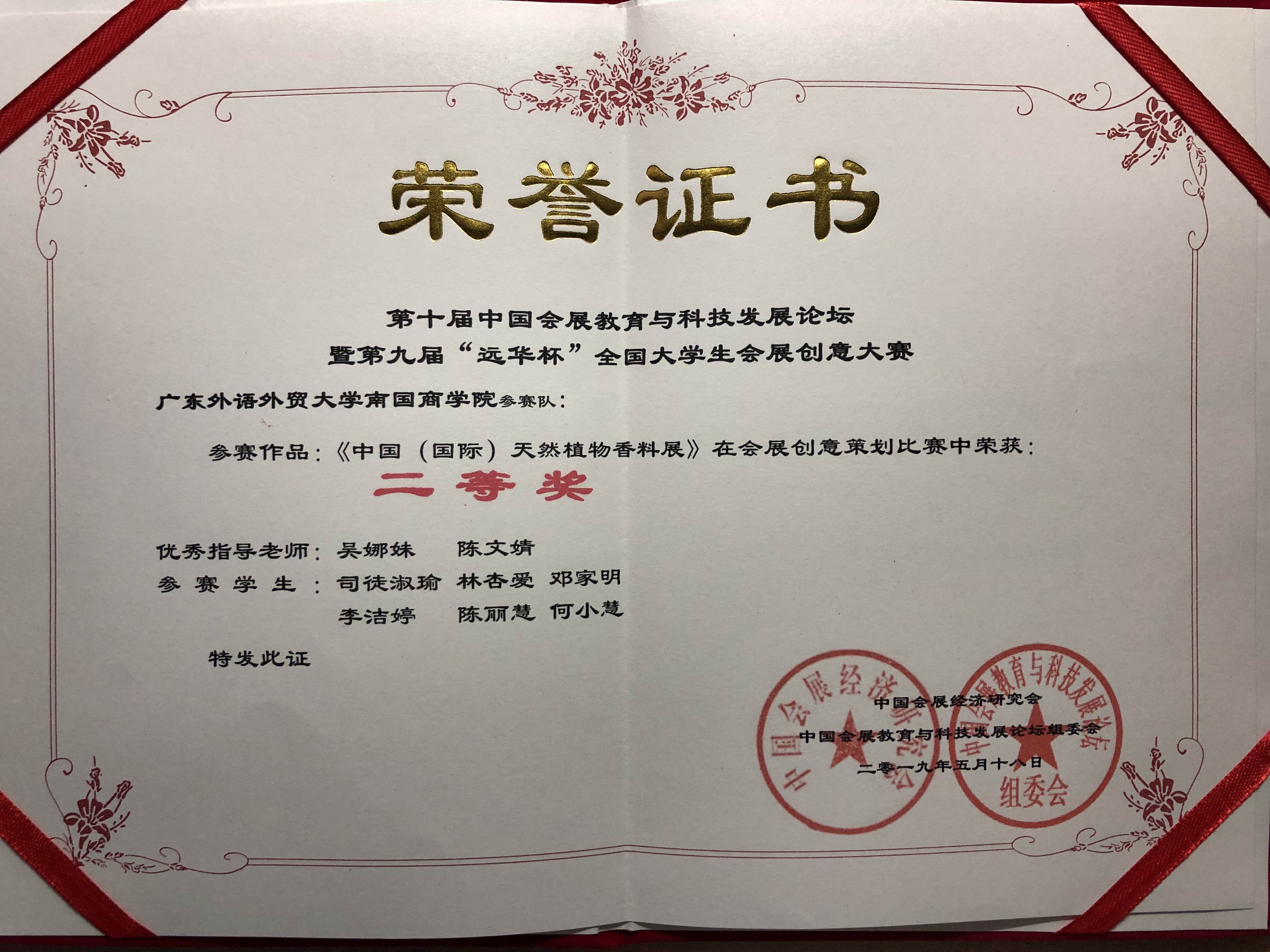 2019年5月16日—18日,第十届中国会展教育与科技发展论坛暨第九届“远华杯”全国大学生会展创意大赛在西安绿地笔克国际会展中心举行。由雷竞技官网2016级会展经济与管理专业以及2016级数字媒体与技术专业的6名学生组成的“Hey girls”跨专业团队参加比赛。经过激烈的角逐,最终凭借优异的表现,获得了会展创意策划组二等奖。