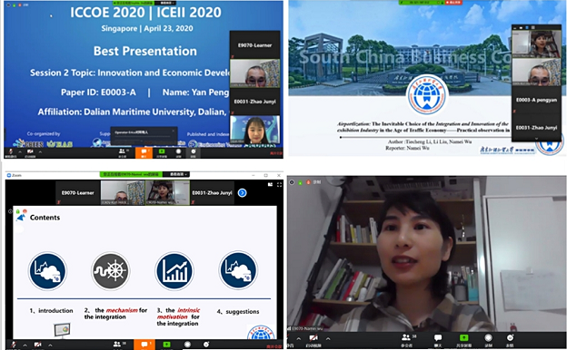 抗疫不误科研,新冠难阻交流。4月22-24日,原定于在新加坡南洋理工大学召开的2020年第十届环境和产业创新会议(ICEII 2020) 利用ZOOM系统以线上会议的方式召开。管理学院李铁成、吴娜妹老师提交的论文“Airportlization: The Inevitable Choice of the Integration and Innovation of the exhibition Industry in the Age of Traffic Economy——Practical observation in China”(临空化:流量经济时代会展业融合创新发展的必然选择——来自中国的实践观察)成功入选,并做专题发言。会议由新加坡国立大学Chou Loke Ming教授、新加坡南洋理工大学Yat-Man LO副教授、加拿大里贾纳大学的Gordon Huang教授和马来西亚双威大学的Koh Hock Lye教授担任主讲嘉宾,入选的50位论文作者代表分别在四个主题版块做主题发言。
