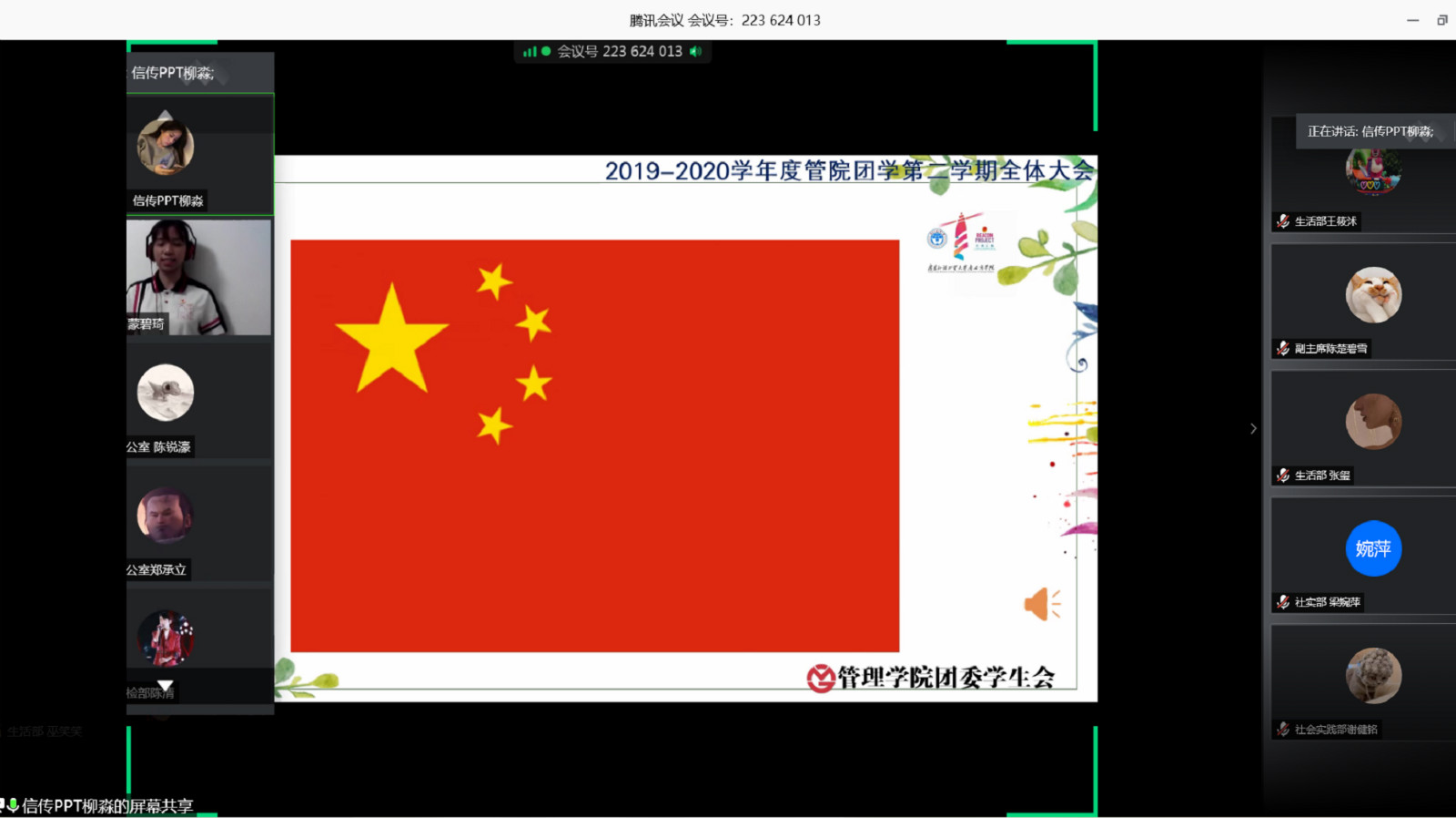 本网讯 2020年5月14日下午2:30管理学院团委学生会第二学期第二次全体大会在线上顺利召开。出席本次会议的有管理学院党总支书记郭婷,管理学院团委学生会指导老师魏迅鸿,第14任管理学院团委学生会副书记龙永锐、主席罗李冰、副主席陈楚碧雪,辅导员梁立为,周俊英,廖疋琦,许翘,李海滨,李健莹以及各部门的部长与全体干事。