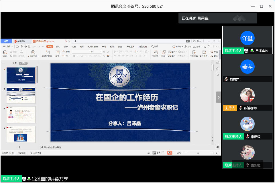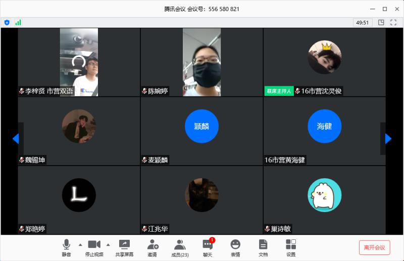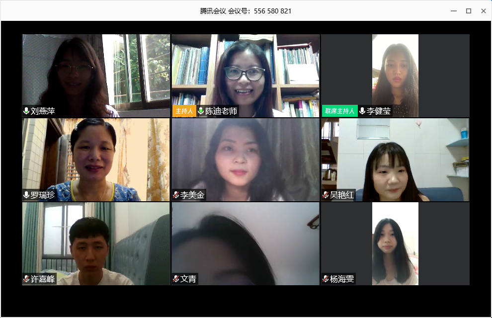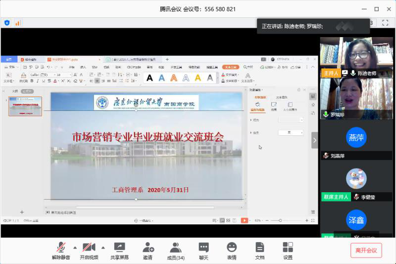 5月31日下午3点,市场营销专业毕业班就业交流班会如期进行,这是同学们大学生涯的最后一次班会,也是一次特殊的云班会。此次班会由工商管理系主任、2016级市场营销班导师陈迪老师主持,以及特别邀请16级市场营销双语班班导师罗瑞珍老师、辅导员李健莹、主题分享嘉宾15级市场营销班的校友吕泽鑫、陈蓝月,还有16级市营、16级市营双语班的同学们参加。