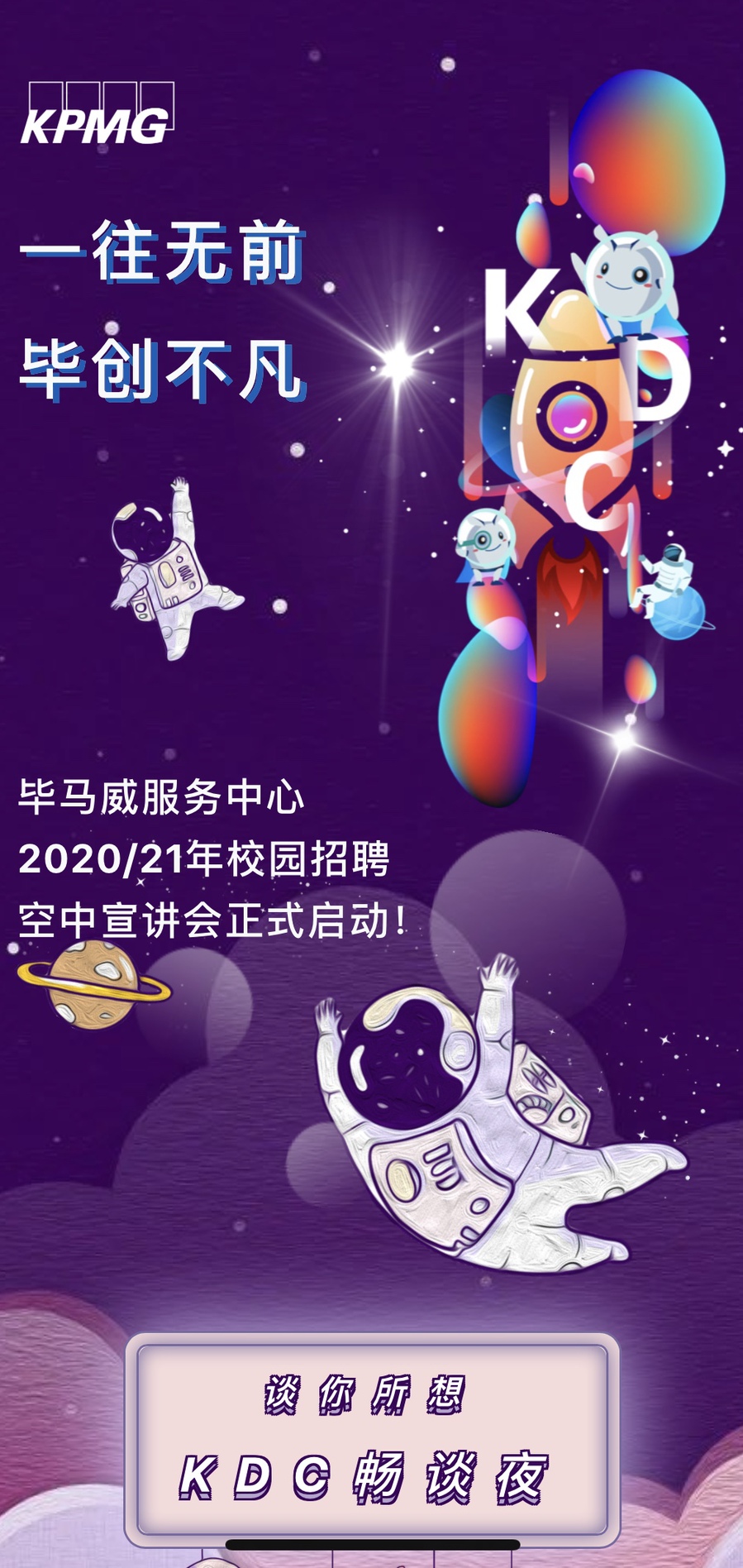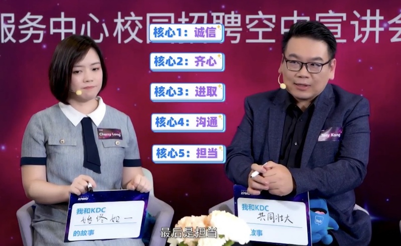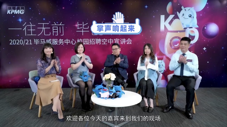 本网讯2020年9月25日晚上毕马威服务中心开展了2021届校园招聘空中宣讲会。出席本次宣讲会的嘉宾有KDC高级合伙人Tony和毕马威佛山的审计总监Cherry,以及在审计部担任高级审计组长Kate和客户尽职调查运营服务中心担任尽职调查主管Richard。
