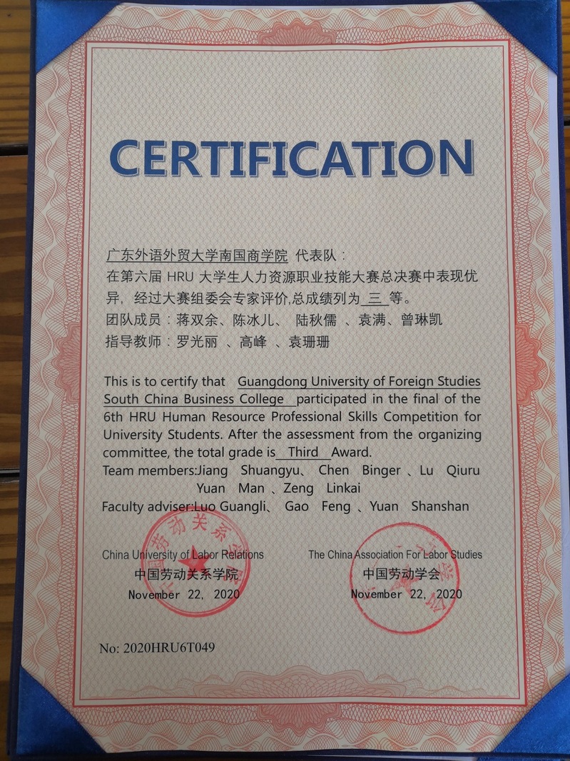 全国HRU大学生人力资源知识技能大赛秉承重在参与、交流互学、和谐美好的参赛原则,迄今已成功举办六届。第六届全国HRU大学生人力资源知识技能大赛的主题为“践行、践业、践教,共建应用型人才增能平台”,共设置实务设计、HR-English、案例分析、职场实战、无领导小组讨论等多个特色环节。广外南国代表队与北京理工大学、中国劳动关系学院、清华大学等来自海峡两岸129所高校同场竞技,经过激烈角逐,取得了优异的成绩。