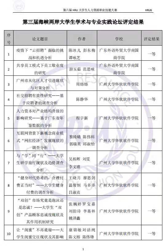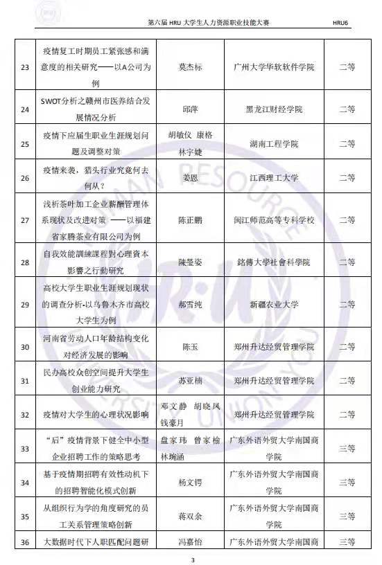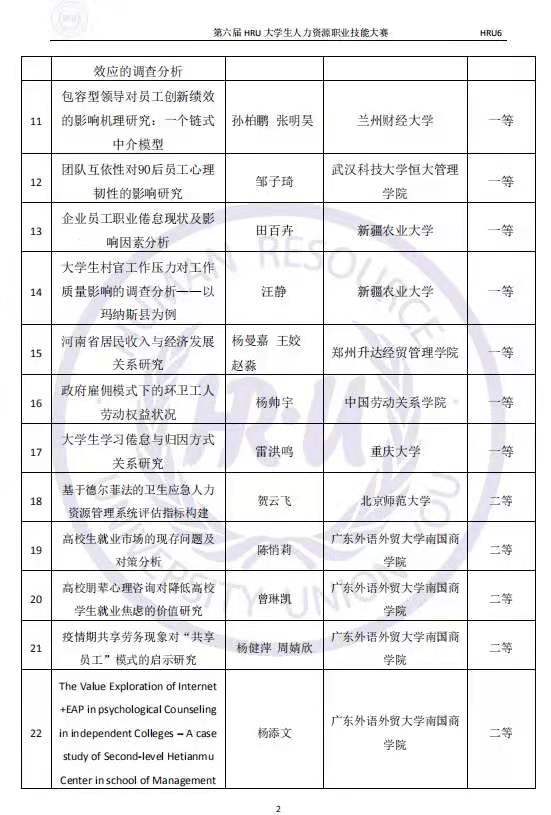 功夫不负有心人,我们HRU论文小组在此次论文比赛中,获得了优异的成绩:在我们小组中,有2份参赛论文获得了一等奖,3份参赛论文获得了二等奖,5份参赛论文获得了三等奖