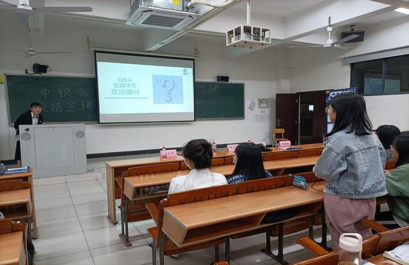 洪经理先为同学们介绍了中职信的基本情况,包括企业结构、业务内容、所获荣誉以及企业文化,特别强调了企业核心理念,核心价值观以及优秀中职信人的优秀核心能力要求。同时,洪经理详细说明了实习生的实习内容以及福利,表达了中职信对人才的渴望,并且给予学生们在职业上的建议。