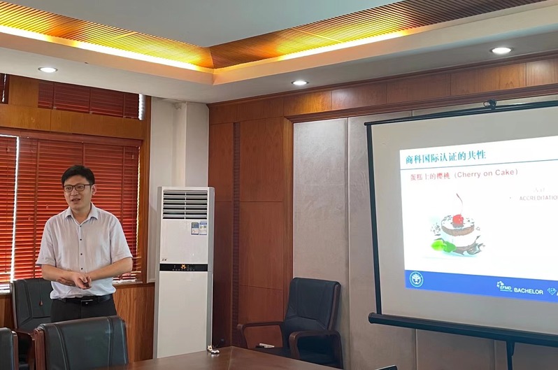 按会议议程,首先,丁浩副院长详细介绍了AACSB、EFMD、AMBA&BGA、CAMEA等商科国际认证体系,并指出国际认证对商科教育的人才培养、学科专业平台建设、国际交流合作等有积极作用;他指出,国际认证应是使命驱动的“闭环”构建,从战略、师资、学科、课程/培养方案、学生、行政管理这六方面形成闭环,建设过程中要注重相关组织架构与功能的实现、注重相关制度的具体化、重视文档的整理与使用;其次他引用习近平总书记的相关讲话认为应走中国特色的商科认证之路,在推进国际认证的过程中强调中国自信。