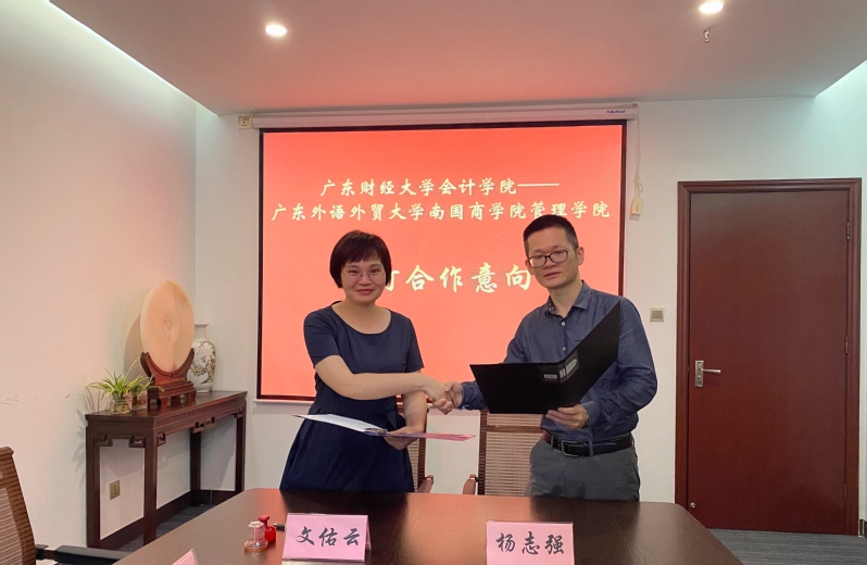 广东财经大学会计学院党委书记邢风云,党委副书记陈发荣,副院长杨志强,副处级辅导员张自广,办公室主任彭文霞等热情接待了我院一行。会议伊始,邢风云对我院一行到来表达了热烈欢迎,并表示双方一直有着良好的合作关系,期待今后的交流更加紧密。文佑云对广财会计学院领导们的热情接待表示感谢,希望未来能进一步加强各方面的合作与交流,带动我院向更高水平发展。随即双方签订了合作意向书。
