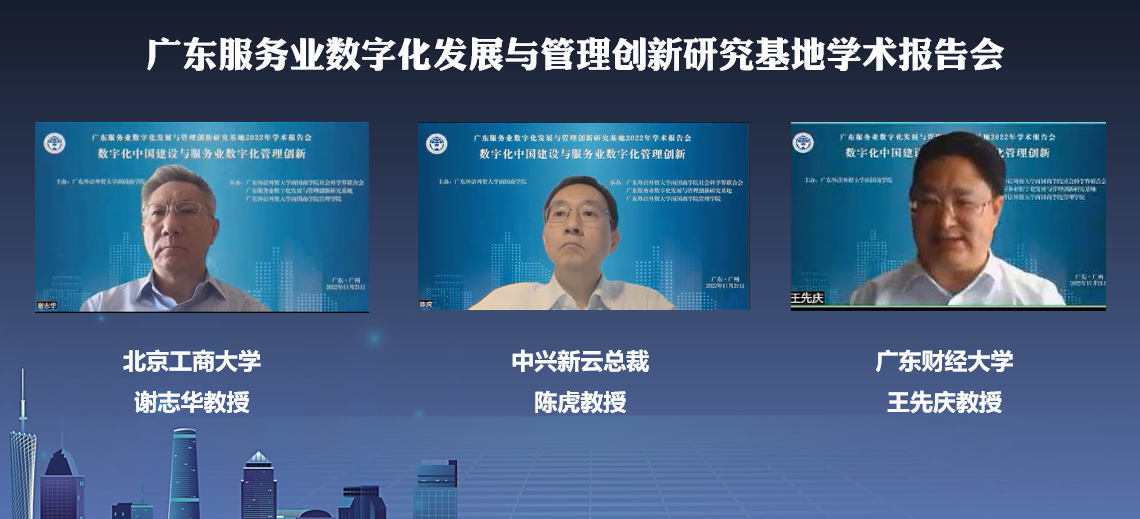 会议第二阶段“学术报告会”,由管理学院学科负责人、基地副主任苏武俊教授主持。北京工商大学谢志华教授、中兴新云总裁陈虎教授和广东财经大学王先庆教授分别作了主旨报告。谢志华教授以“人类革命:从行为革命到认知革命及其融合”为题,就人类从农业经济到工业经济、再到数字经济的发展过程展开分析,详细阐述了在这一过程中人类的行为和认知间的关系,认为技术的不断进步,一定是行为革命和认知革命充分融合的结果;因此,教育应从知识导向的教学向场景化导向的教学转变。陈虎教授围绕“数字化再造财务——从数据走向决策 从财务走向财经”,指出数字化财务职能体系急需以“场景+数据+算法+模型”的工作方式转型,将数据科学引入财务领域。王先庆教授围绕“新技术背景下市场营销数字化转型的五大方向与体系重构”,提出在数字化背景下,营销的底层逻辑发生了根本性变化,在营销战略、营销内容、市场定价、营销渠道以及营销组织上,必须以数字经济为基础,适应新逻辑,转型新思维。