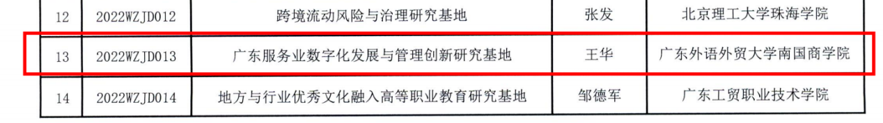 据《广东省教育厅关于公布2022年度普通高校重点科研平台和项目立项名单的通知》(粤教科函〔2022〕4号),执行校长王华教授领衔申报的广东服务业数字化发展与管理创新研究基地获批广东省普通高校人文社科重点研究基地,这是我院在科研平台建设方面取得的重大突破。