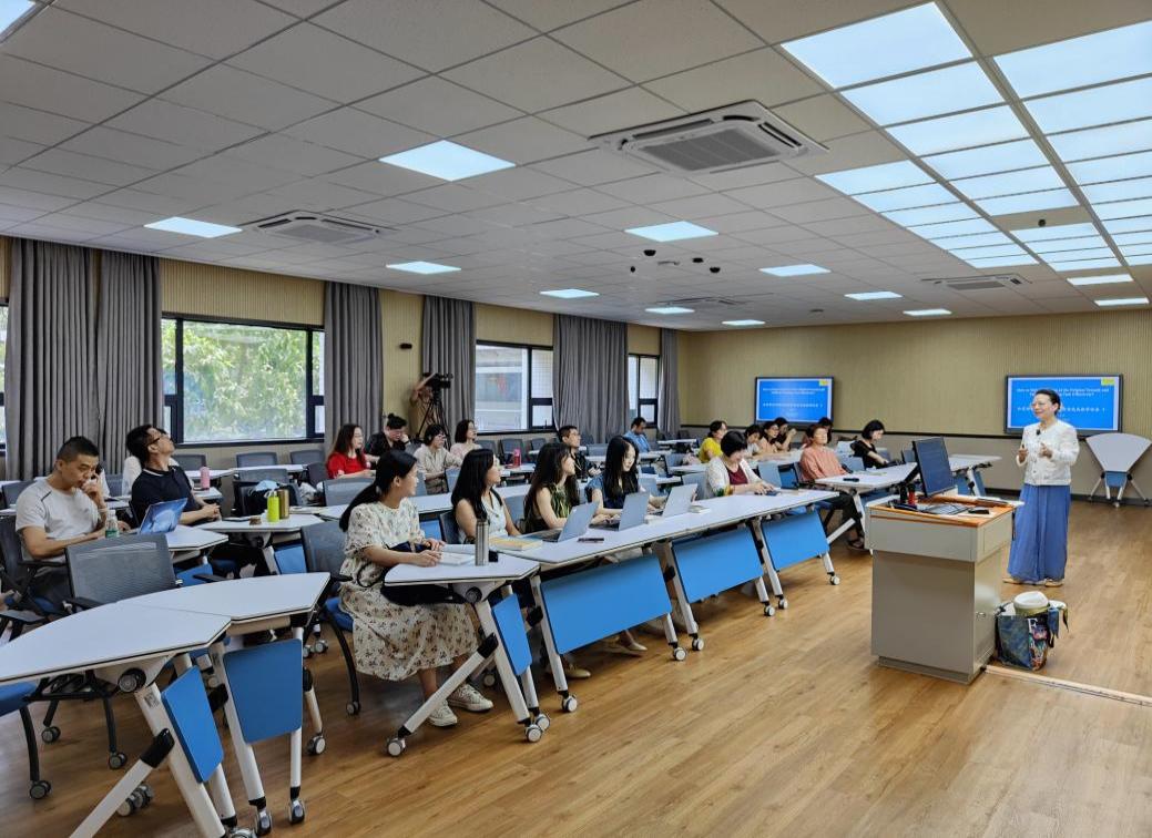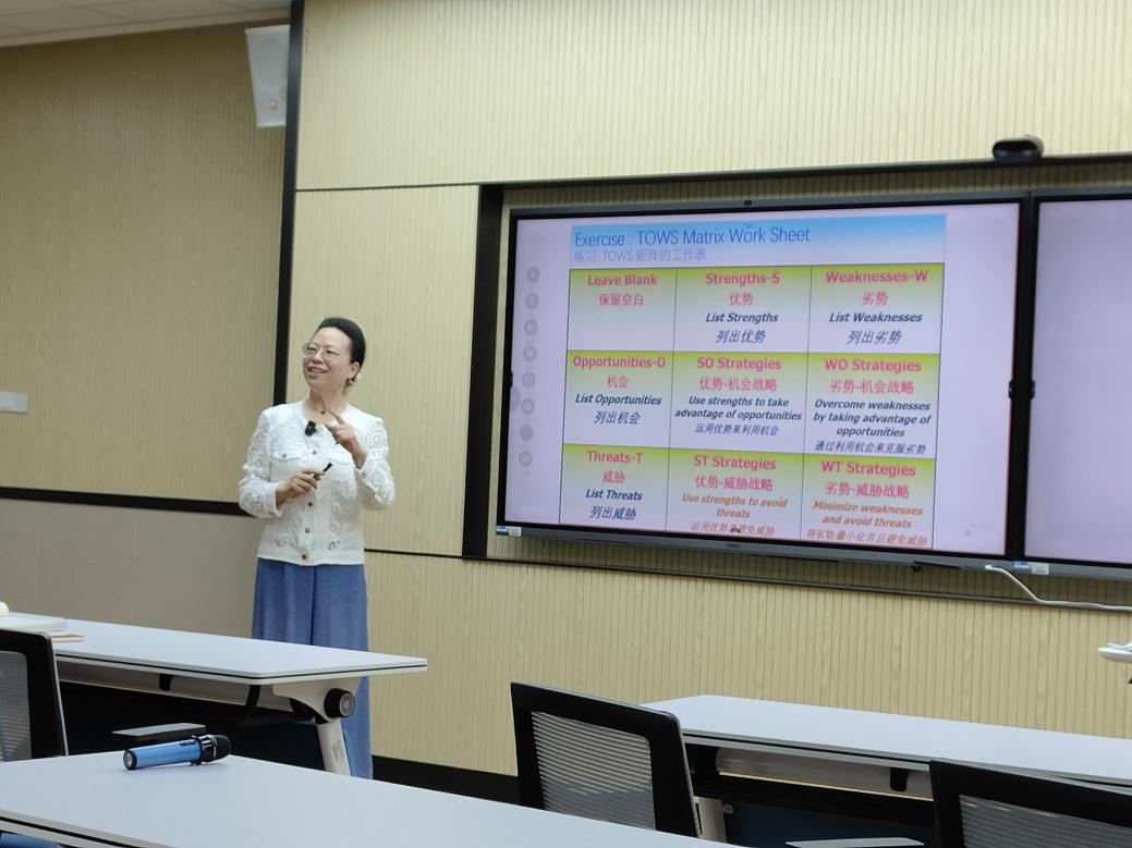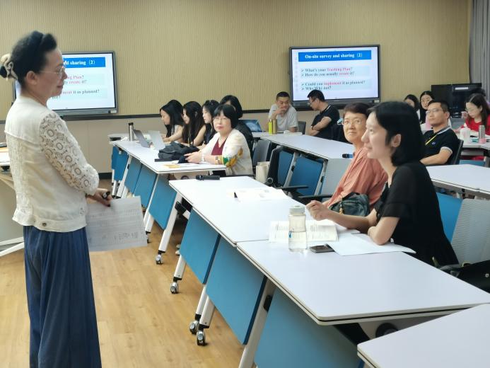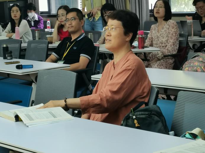 接着,杜教授结合自身的学习工作经历,用风趣幽默的语言与双语教师分享了她对课程设计的见解和原版教材的使用经验。介绍了学生和教师的“三步读书法”(“猛虎跳跃法”、“乌龟爬行法”、“雄狮回首法”)以及一些学生学习的案例,鼓励教师在教学过程中注重培养学生批判性思维(从学习知识到自我反思)和解决问题(从理论到实际商业实践)的能力。