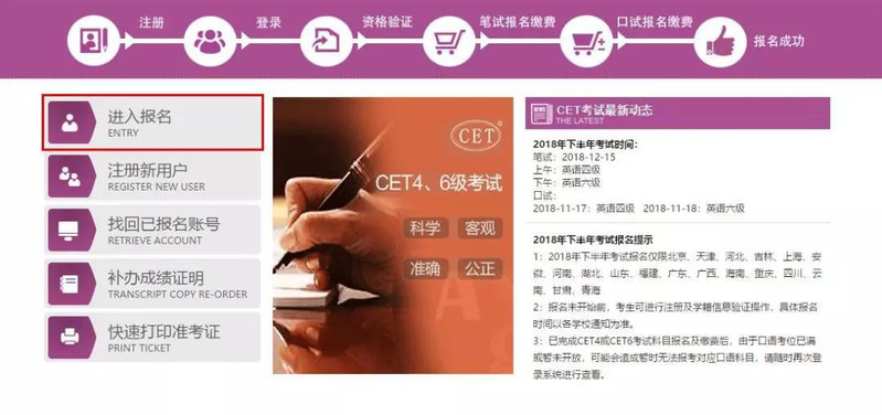 考生注册完成后,请返回网报系统主页面(http://cet-bm.neea.edu.cn/),点击“进入报名”,输入账号、密码及验证码,点击“登录”进入资格确认复核界面。