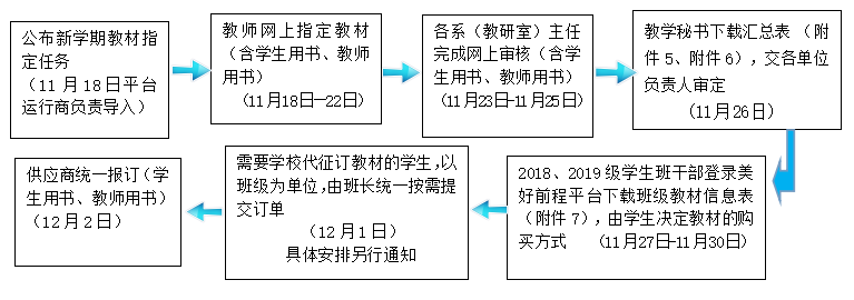 各教学单位按照逐级审定的原则,在2020年11月18日-12月2日完成各个环节相应的任务。教材征订程序如下图: