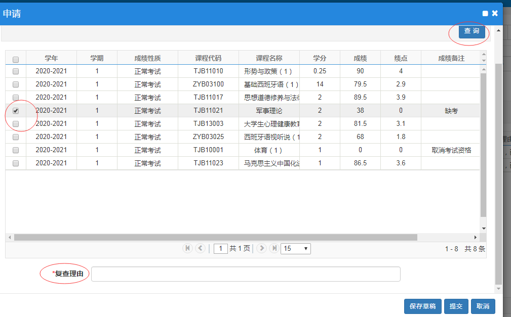 请各教学单位通知学生在3月1日至8日核查2020-2021学年第一学期期末考试成绩。如对成绩有异议,需要核查成绩或核查试卷的,须在3月8日前通过新正方教务系统进行成绩复查申请(登陆http://jwgl.gwng.edu.cn,在“报名申请”-“成绩复查申请”-“申请”,点击“查询”,勾选课程,填写“复查理由”,并提交)。