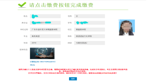 确认个人报名信息无误后,点击“缴费”按钮完成考试报名缴费,完成报考。未缴费成功的,视为无效报考。