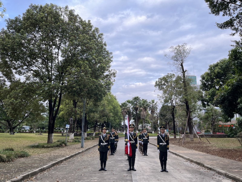迎着初升的晨曦,全院同学穿着整齐,面向国旗肃立致敬。国旗护卫队迈着整齐的步伐护送着国旗。伴随着庄严的国歌声,在全院师生的注目礼下,五星红旗冉冉升起。这一刻,我们为国家精神热泪盈眶,为国家力量心潮澎湃。