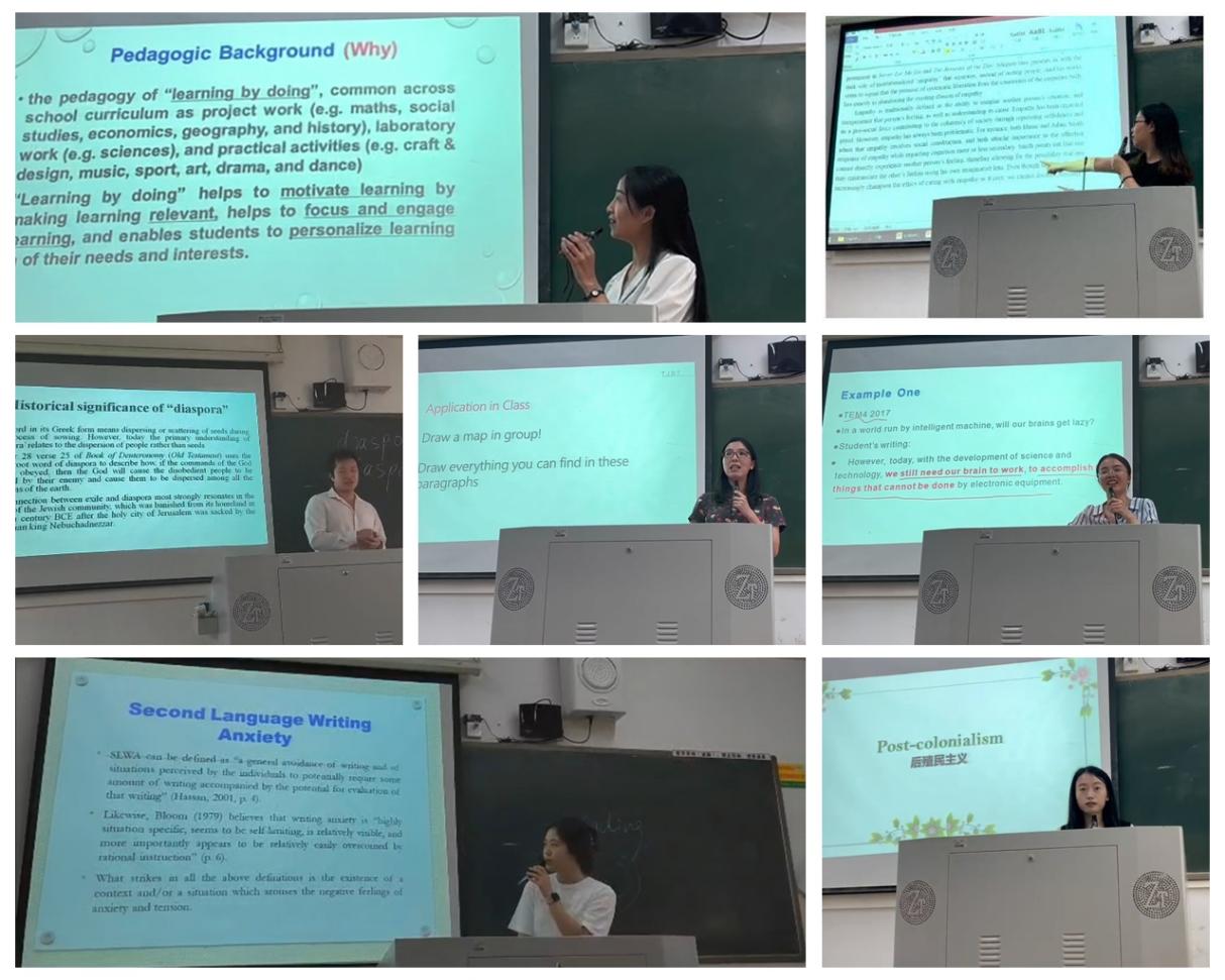 其他青年教师也纷纷发表个人心得。彭瑶博士分享探讨了英国籍作家石黑一雄小说展现的共情的虚幻性。兰玉老师分享了任务型教学法的二语习得研究背景和“任务”的内涵意义。谢真老师分享了对以下问题的思考:基于人工智能的AWE系统会帮助学生学习语言吗?我们应该推荐学生使用自动写作评估系统还是基于人工智能的释义工具? 在读博士李东洪老师分享了什么是diaspora literature(离散文学)以及与其相关的殖民主义的概念,介绍了Amitav Ghosh, V.S. Naipaul, Sake Dean Mahomed 这几位印度裔的英语作家,并重点介绍了Jhumpa Lahiri的多文化成长背景,分享了她 Interpreter of Maladies 这本书里面的一个小故事,指出流亡的状态可以使一个人成为世界上所有文化的继承者,这开启了巨大的可能性。罗瑜老师分享了综英课学习疲惫的解决之道,主要分析学习厌倦的原因,如天气、备考、课文哲学性内容等。通过visualization视觉化方法设计课堂活动,增加课堂趣味性,比如第四单元作者夜间探索中央公园的描写,让学生小组画地图,从而查找教学盲区,提高学生兴趣。汤昕老师分享了二语写作焦虑量表和写作焦虑原因表,希望能帮助学生解决写作焦虑的问题。姜依玲老师介绍了后殖民主义的定义,三位代表人物赛义德,斯皮瓦克和霍米巴巴,并介绍他们三位的代表性观点。